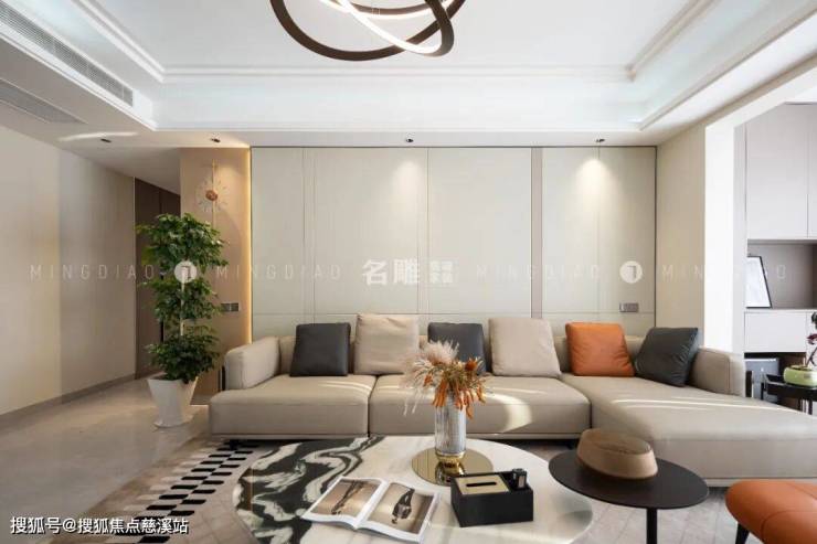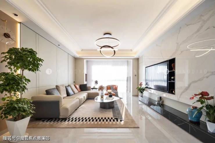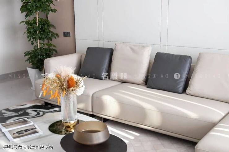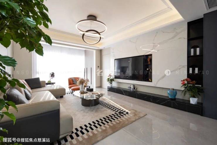 米灰色沙发打破了常规客厅家具布置的沉闷,与雅士白大理石电视背景墙碰撞出“刚柔并济”的氛围,在“奢居”中隐喻精致,在“简居”中勾勒活力。