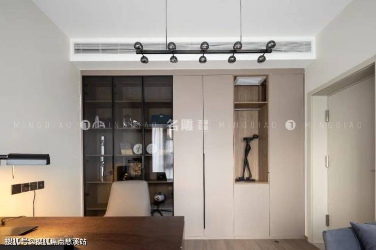 书房简单陈设,书柜与墙面齐平,有开有合,功能丰富,无论是色系的搭配还是软装的选择,都极大地彰显了当代生活的惬意和浪漫。