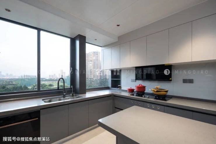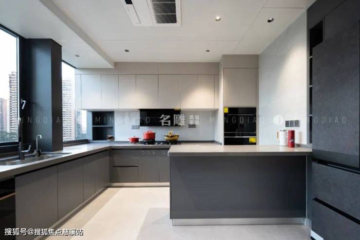 厨房布局干净利落,白色台面和黑色橱柜,为烹饪提供清爽干净的操作空间。嵌入式厨电让整体更美观一体,增加储物量同时也让功能更多元。