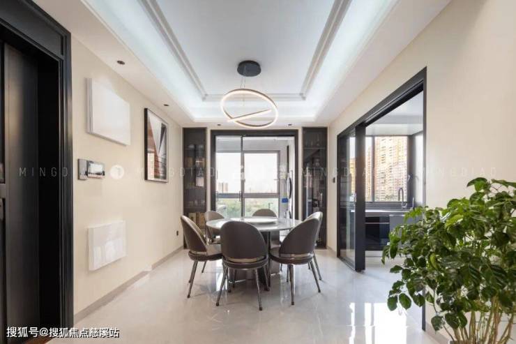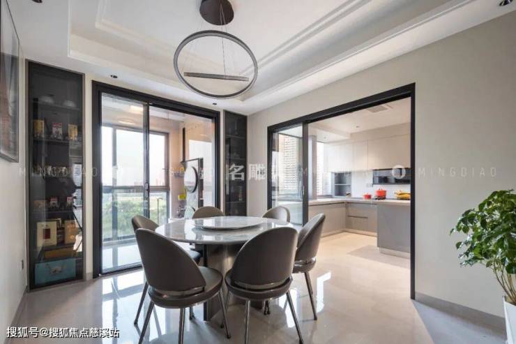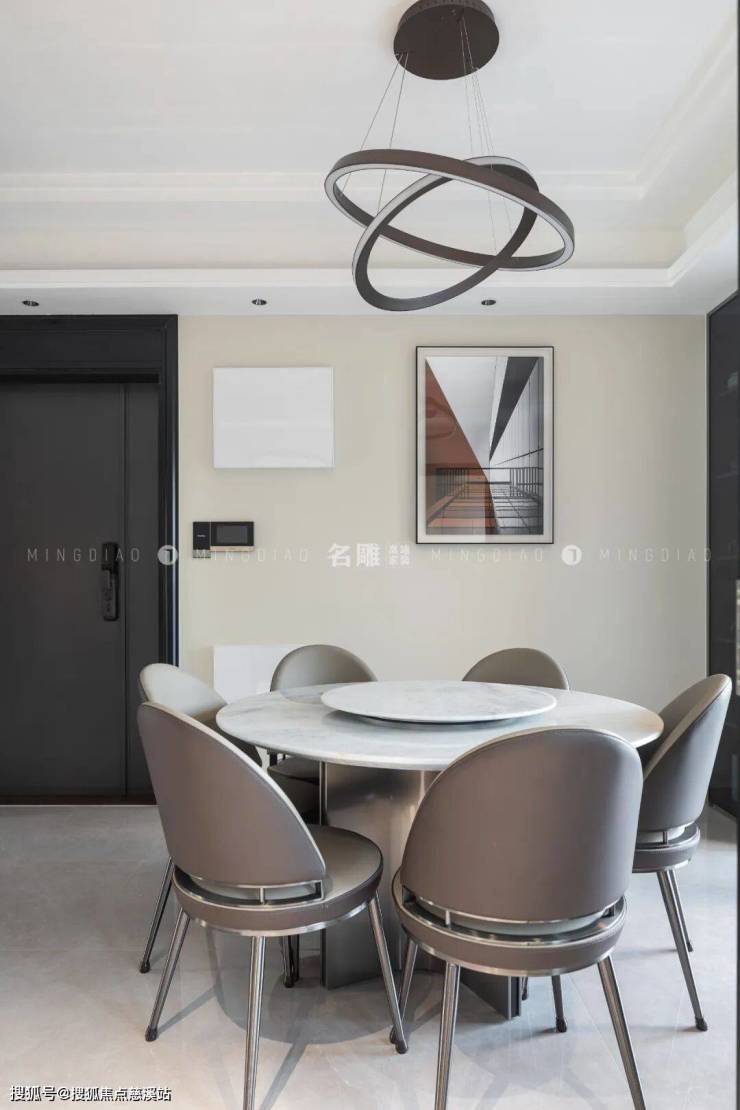 餐厅区域以实用为主,皮质餐椅围合石面圆桌,打造中式“圆”满美学,柔和的自然光透过玻璃门形成温暖的光晕,照亮了整个餐厅,充满诗意和美好。