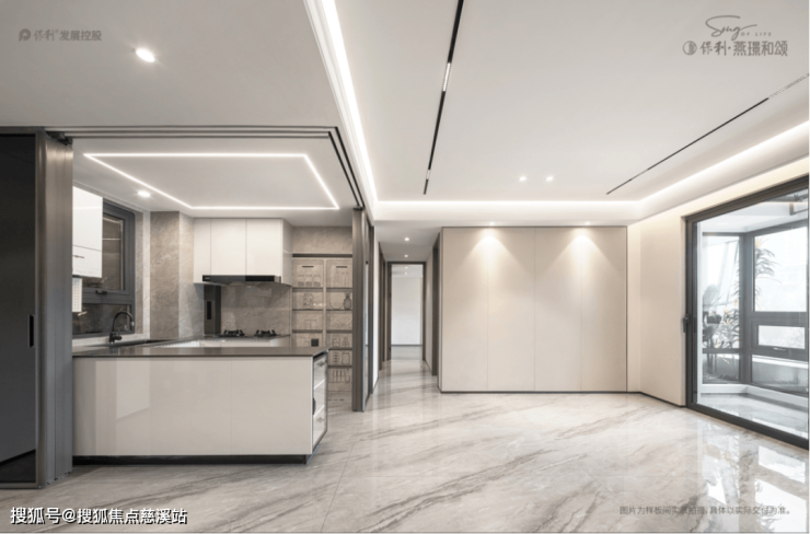 除了超大宽厅设计之外,厨房两侧为推拉移门,LDK一体化设计,连接着宽阳台,还带有270°转角窗,IMAX视野,可以将窗外的美景尽收眼底。
