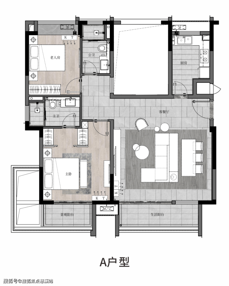 特点:一梯二户、板式设计、南北通透、户型方正、横厅设计、阔大飘窗、宽大景观阳台