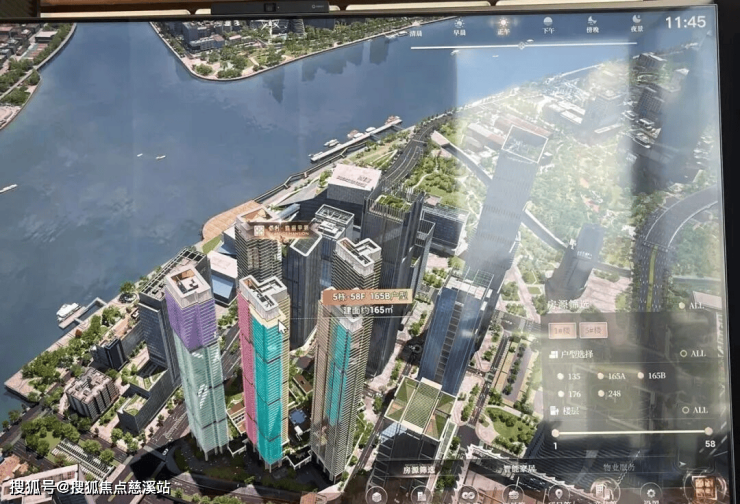 共5栋楼,总高56-58层,首推1/5栋,1栋57层,43层以下是两套176方的,45-57层是一套248方的,5栋是塔楼,一户139,两户165,超新规产品,得房率据说有130%。