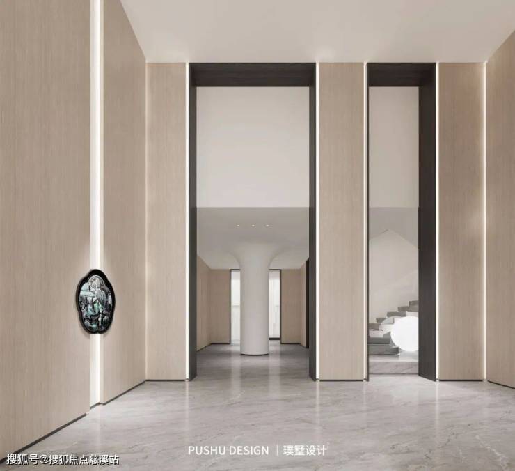 过道以简洁的线条和温润的材质为主调,墙面选用浅木纹饰面板,与深色线条形成鲜明对比,营造出一种深邃而优雅的氛围。地面采用灰色石材铺设,呈现出天然的肌理感,与空间的整体色调和谐呼应。灯光设计隐匿且精妙,灯带融入墙面,既突出立面层次感,又增强了空间的通透性。