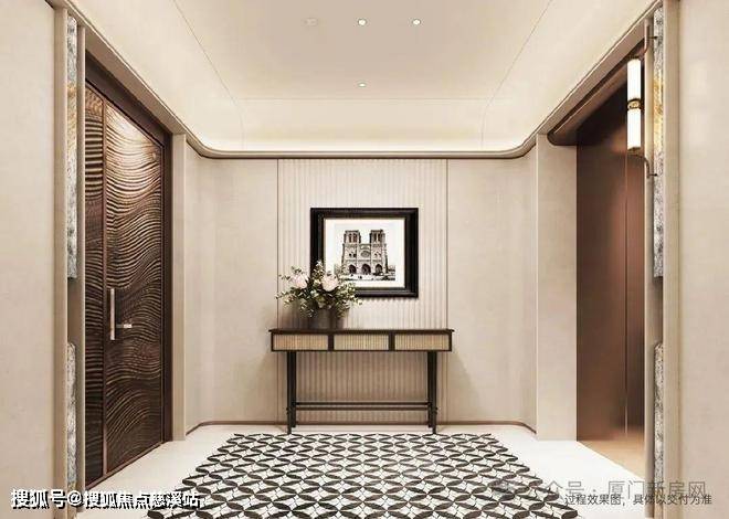 入户大门是高定铸铝子母门,还有特别定制的“波光晴纹”,寓意大富大贵。加上双重饰面,豪宅的气度一下就有了。耶鲁六合一智能锁,与智能家居系统联动,实现开门即开灯、开空调的效果。整个电梯公区的地面也都铺了保利天悦专属的水刀拼花工艺地砖,费时费工,细节处也尊贵感拉满。