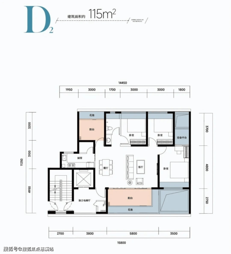 🏠D2户型:约115㎡四房两厅两卫