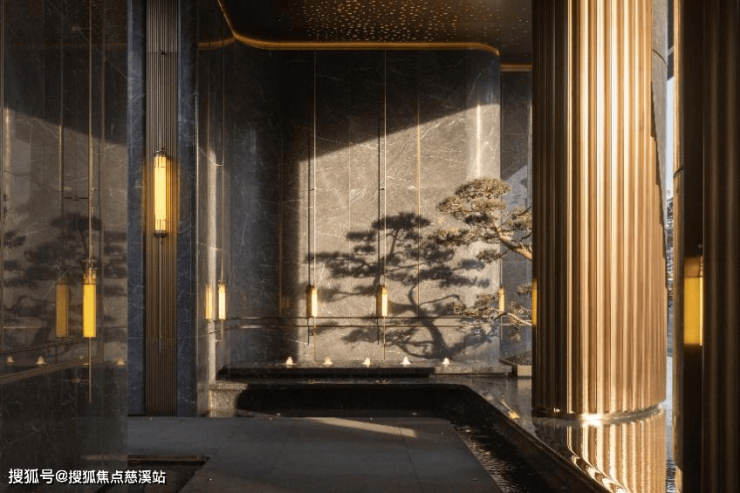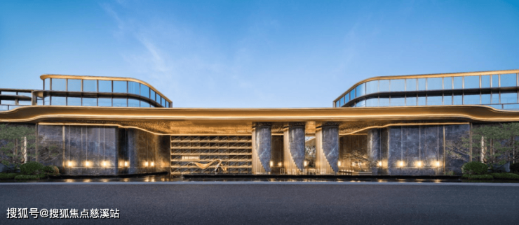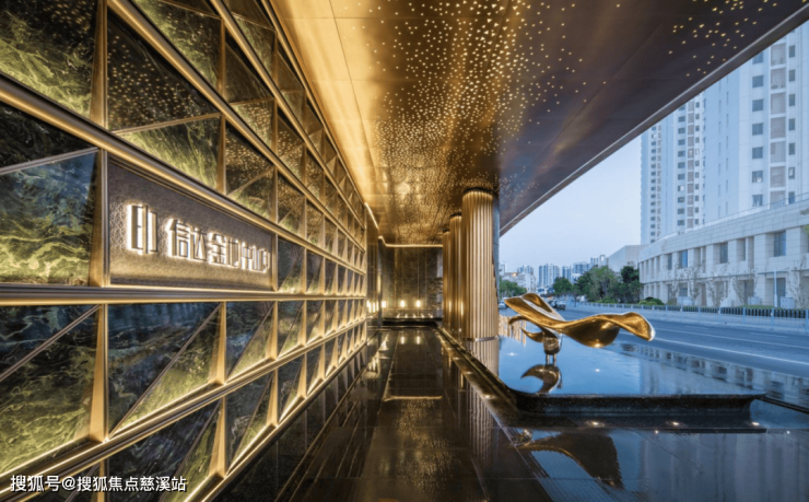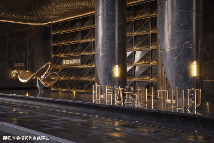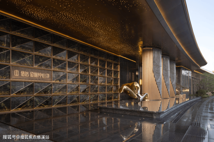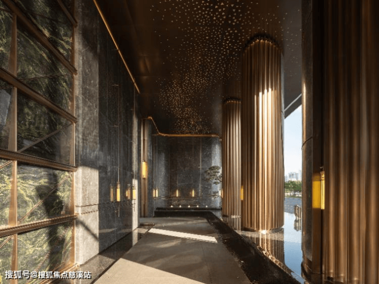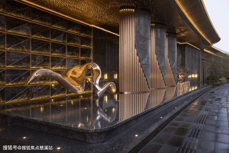 40m超宽的门楼界面,精致化的logo及艺术雕塑,品质水景结合三个形似风帆的立面柱子营造一帆风顺的吉祥寓意,巨大的星幕穹顶门廊极具仪式感,彰显艺术、品质、精奢的酒店尊享式礼仪入口。