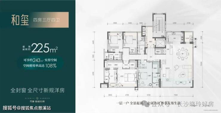 【四房两厅四卫】建筑面积约:225㎡;实得面积约:243㎡;实际得房率108%;相当于旧规286㎡!(旧规户型按85%得房率计算,仅供参考)