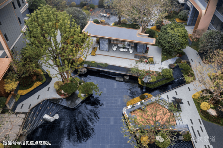 整个园林采用围合式布局,拥有“七大主题组团与四大功能空间”,其中,中庭景观园林约3300㎡,采用对景、借景、框景、障景的造园手法运用,营造出沉浸式的酒店式度假秘境。