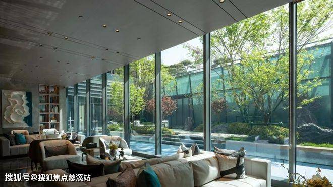 1.2万㎡实景“后花园”,青翠绿植环抱,层叠山脉提供了空间进深感。苍劲的黑松和流动的瀑布,是动与静的对比,又是静寂与活泼的平衡,山石松柏尽显古韵。