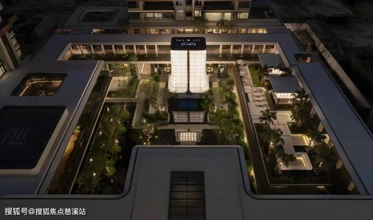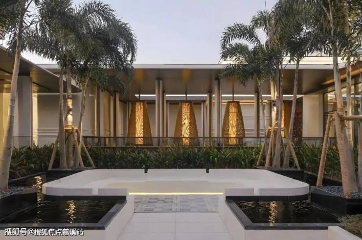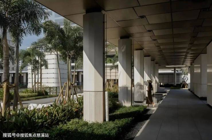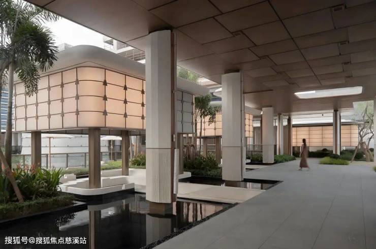 下沉庭院并非单纯的景观点缀,而是串联社区功能的核心枢纽,与会所、归心长廊、中庭花园无缝衔接,形成“归心长廊→下沉庭院→中庭花园”的渐进式景观动线。庭院以镜面水景为核心,水面如镜,倒映着周边的绿植与建筑,微风拂过,波光粼粼,仿佛将海棠湾的海水引入社区,自带静谧松弛感。