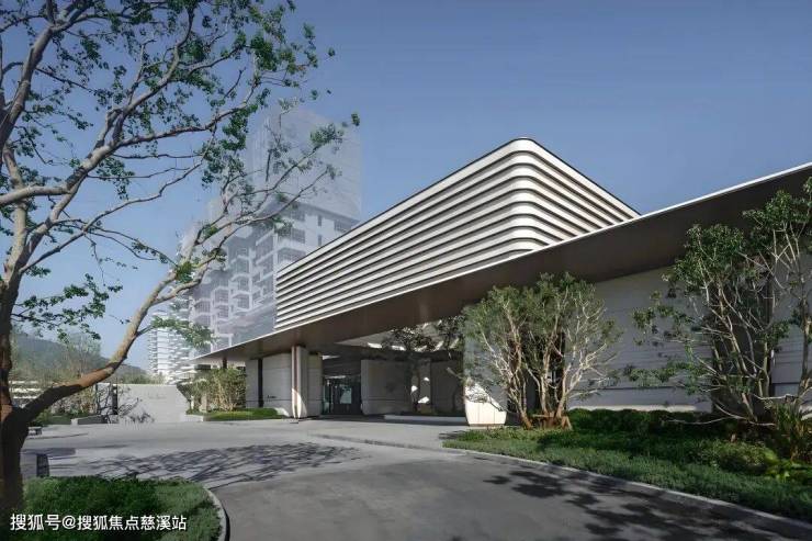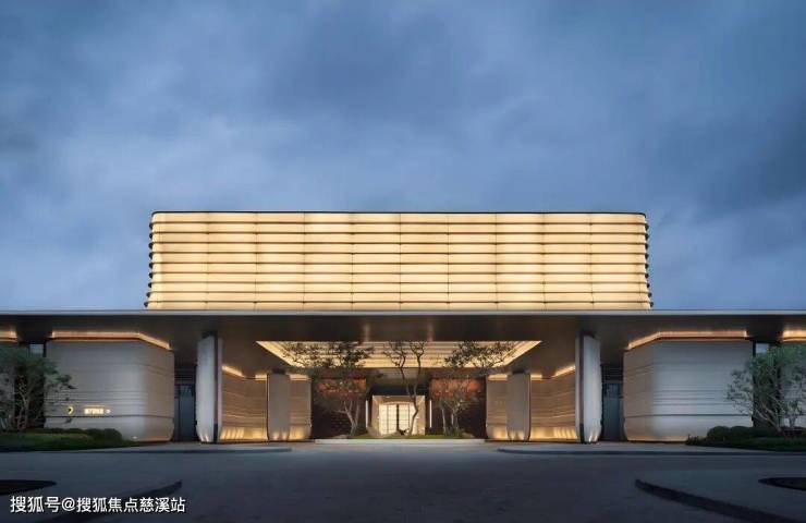 门庭核心由四根轻盈的弧形柱体支撑,柱体采用米白色石材拼接红色洞石,内嵌暖光设计,白天温润雅致,夜晚光影流转,自带柔和氛围感。柱体上方是双曲面钢结构悬挑屋面,覆盖云石玻璃,形似扬起的船帆,既有海上航行的灵动,又有高端度假的仪式感,远远望去,如同一座漂浮在绿意中的艺术建筑。