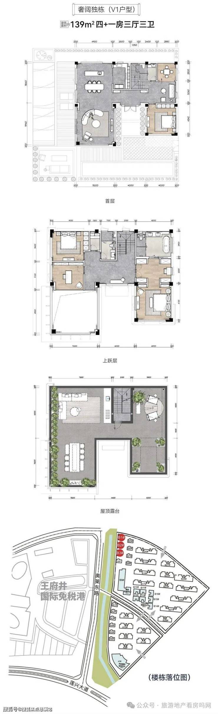 奢阔独栋-V1户型:4+1房3厅3卫,产权建面约139㎡,实得建面约236㎡,屋顶露台约127㎡,花园约200-300㎡,层高为6米。该户型为奢华4+1房,中空挑高客厅设计,自带阔绰屋顶露台,独立花园,进阶院墅人生。