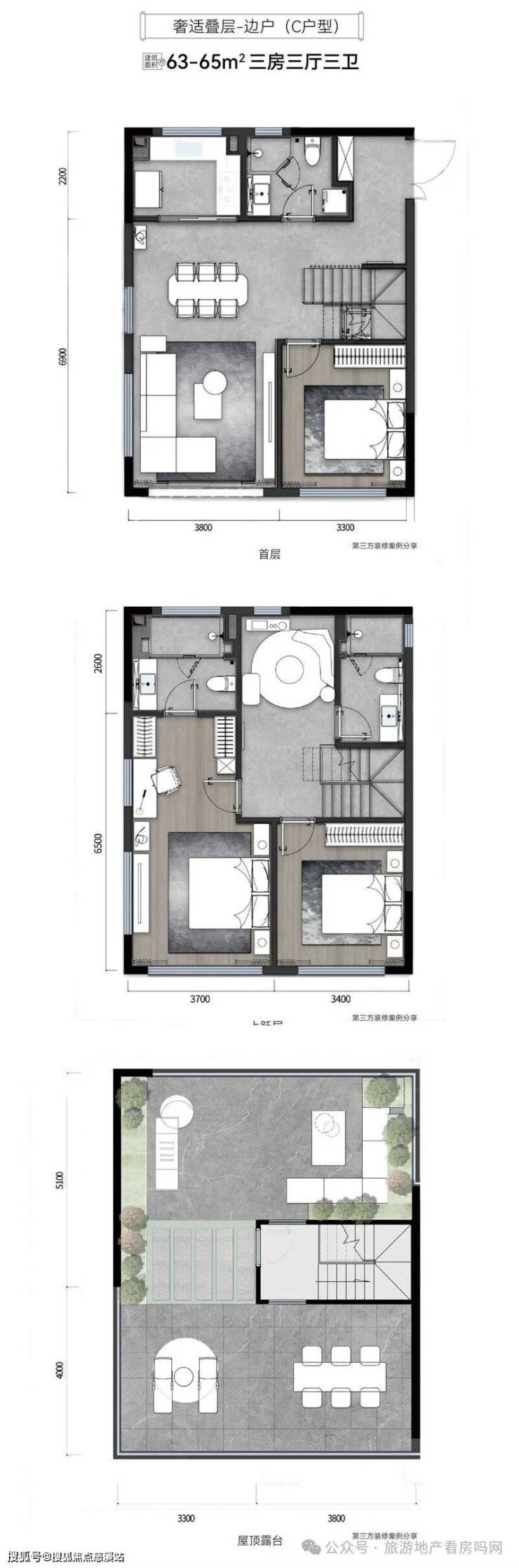 奢适叠层-上叠边户(C户型):3房3厅3卫,产权建面约63-92㎡;实得建面约145-152㎡,层高为6米,上叠赠送约50-60平米屋顶露台。该户型南北通透格局,采光极佳,双层使用空间,高利用率;阔绰屋顶露台,舒适三房。