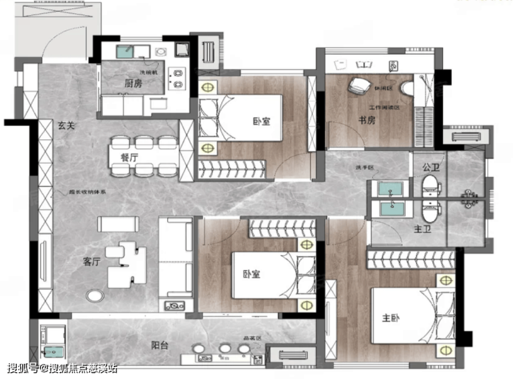 115平米:四房两厅两卫,四开间朝南,同样算是比较主流的布局,常见于一梯一户或者洋房的楼栋,对比建总的115平,优势在于得房率更高。