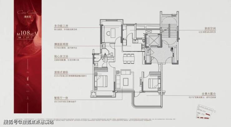 建面约108㎡三房两卫户型,客厅开间达到约4.5米,南北通透,三开间朝南,三个房间分布在三角落,互不打扰。能带有家政间和露台,直接省去了过道部分,功能性极强,使用率达到约97%(不含空调隔板)。
