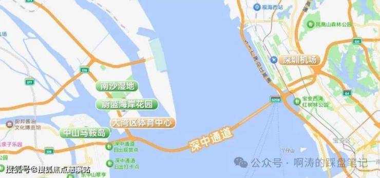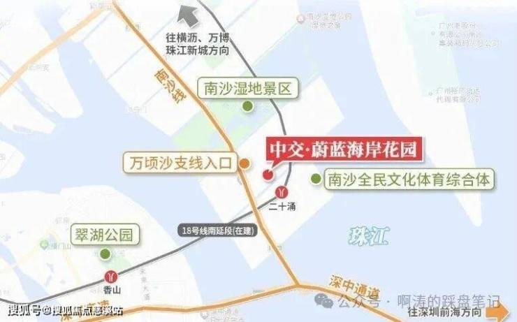项目距离已通车的深中通道南沙线收费站约1公里,驱车自驾仅需半小时,即可到达深圳前海。而距离在建的18号线南延线(南中城际)二十涌站约500米,该线路设计时速高达160公里/小时,分为东西两线:在建西线至中山市区,预计2027年建成通车;东线直抵珠海拱北口岸,计划2030年建成通车。