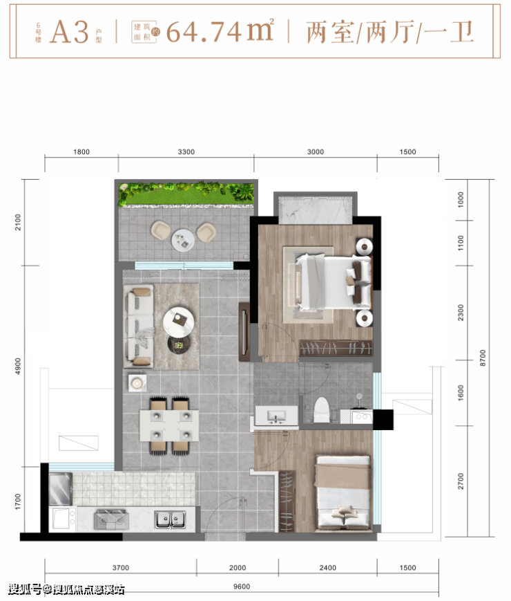6 #楼A3户型约64㎡精致两房两厅一卫