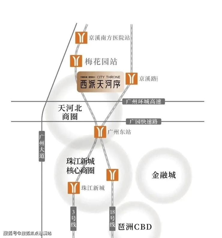 项目距离地铁3号线梅花园站仅350米,2站广州东,5站珠江新城,8站机场北。周边还有地铁18号线北延线京溪站预计2026年开通,开通后1站广州东站、2站冼村、3站琶洲。