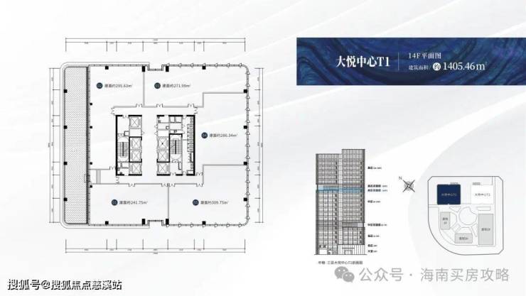 【楼栋概况】:🔍大悦中心T1,城市之光,高度88米,共20层,总建筑面积约3万㎡,在售户型建面约:267-316㎡,6梯6户,标准层高约4.2米。