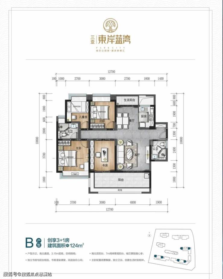▼B户型:建面约124㎡创享3+1房