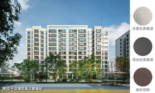 楼栋立面为现代风格体系,注重立面的对称,利用新材料和新结构的搭配,追求简洁现代美。材料的选择注重质感与色彩的统一,采用米黄为主、深灰为辅的色调建筑表皮,辅以简约边框设计,使立面更加简洁轻盈。