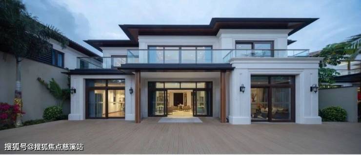 海棠潮鸣别墅统一采用二层造型,形体比例舒适宜人,墙面以仿石涂料为主,突出的门头位置采用葡米石材,主体以均衡的虚实比例及考究的细部线条营造价值感。屋顶采用仿柚木铝合金的深远挑檐及平坡结合的方式,打造热带风情和度假氛围。
