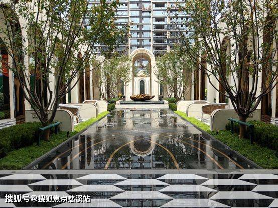 归家大堂的北侧,就是楼栋间的景观,也是社区内的一个公园组团。这样的社区感觉,让每一次的行走其中,都能感受到宛如生活在度假酒店里的氛围感。包括景观间都有风雨连廊的连接、金属包边的拱券造型、水系的搭配、品种繁多的植物、地面的黑白拼接瓷砖以及金属花卉雕塑,极大地突出了整个园林的度假感,给业主进入社区的这一刻就带来“归家即度假”的感受。