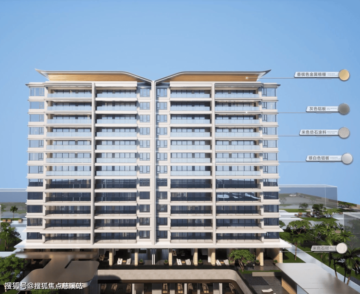 材质的选择也极尽克制,以米色石材与米色仿石涂料为基底,搭配银白色铝板与灰色铝板,顶部再以香槟色金属格栅点睛。