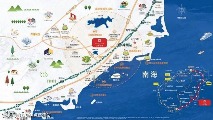 中南漫悦湾坐落于海南万宁兴隆镇,这个被誉为“多彩万宁”的地方,不仅拥有得天独厚的自然风光,还享受着海南岛东轴芯的地理位置优越。项目距离东线高速仅1公里,距离神州高铁站2公里,小区门口即有公交站牌,交通十分便利。无论是自驾出行还是乘坐公共交通,都能轻松抵达海南岛的各个角落。此外,项目周边还有石梅湾、日月湾等著名旅游景点,距离中南漫悦湾分别约8公里和16公里,让业主在享受便捷生活的同时,也能尽情感受海南岛的自然美景。