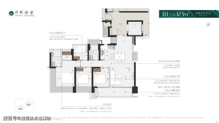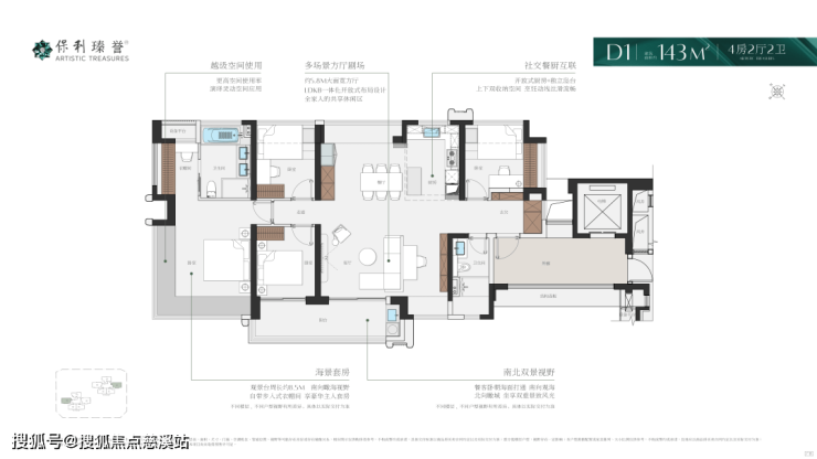 143竖厅户型,5.8米超大客厅开间,开放式L厨房与岛台设计,可以做到4+1格局,满足三代同堂,南北双景观面,南面看海,背面看城,主卧4.3米开间带独立衣帽间,270度转角飘窗城市夜景尽收眼底。