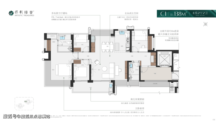 138㎡户型采用场景方厅剧场,约5.7米LDKB一体化开放式布局设计,客餐厨全打通 满足多元居家场景,南北双观景面南北通透 自然通透观景更惬意,主卧套房南向景观视野 步入式衣柜 更享尊崇主人生活品。