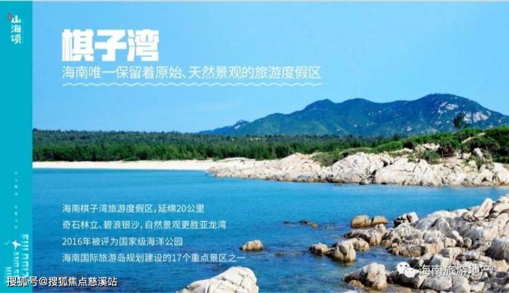 1,棋子湾片区位于海南西部昌江境内,自然风光得天独厚,汇聚行业精英,以主题酒店及商业、度假居住、滨海休闲三大板块为核心,精心匠筑,集山、海、林一体的大型国际滨海旅居康养目的地。东倚昌化岭,西连大海,东西长约20公里,呈S状,水清见底,沙细质软,洁白如银,曾为北京奥运会沙滩排球场地提供比赛专用沙。棋子湾片区四季如春,阳光明媚,是难得的天然浴场,也是光浴和沙浴的理想之地,在这里还能欣赏到最美的落日,同时这里也是海南独有的半干旱区域,气候干爽宜人。是一个宜居、宜游、宜养的“海南十大最美海湾”之一的湾区。