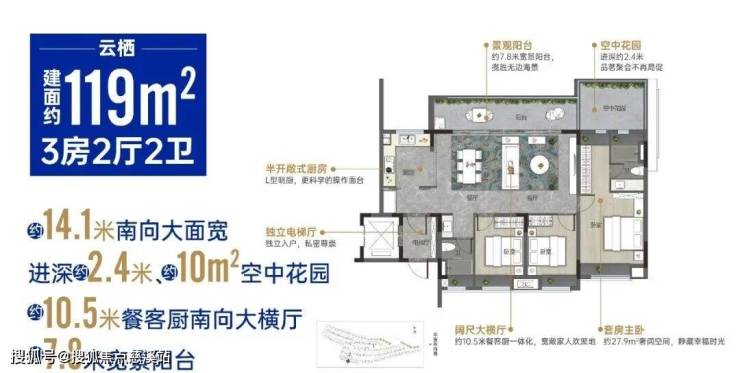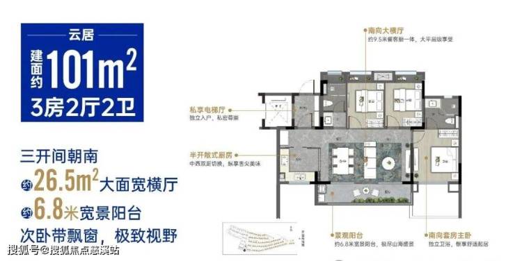 户型产品有101平米,111平米和119平米的三房,都有横厅的设计,阳台很大,精装修,带中央空调。都是一梯两户,电梯双开门的设计。一楼是111平米的,带大花园。