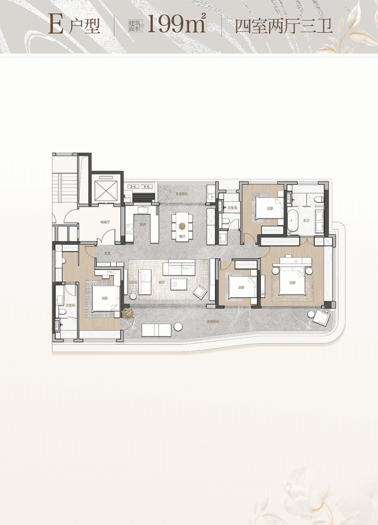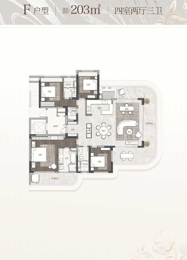 设计师从全球范围内汲取灵感,其中迈阿密、迪拜、澳大利亚的度假公寓凭借其独特的风格和先进的理念为设计师提供了宝贵的设计灵感。项目共有6种户型,涵盖建面约107㎡—203㎡的面积段,空间感阔绰。