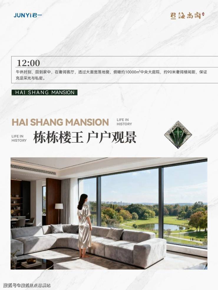 12:00——午休时刻,回到家中,在奢阔客厅,透过大面宽落地窗,俯瞰约10000㎡中央大庭院,约90米奢阔楼间距,保证充足采光与私密。