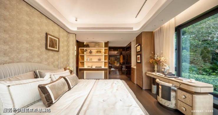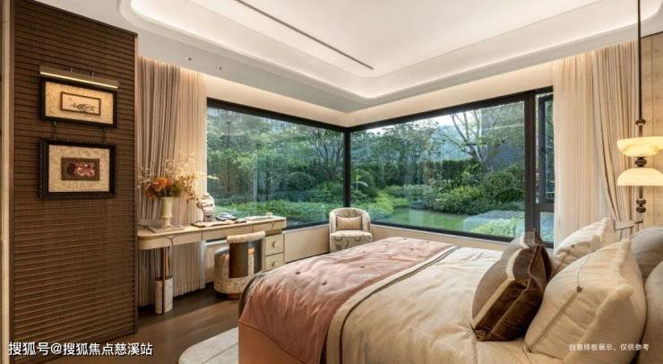 雅致视野:主卧采用大面积玻璃窗和270°转角窗设计,将中央园林景观引入室内。