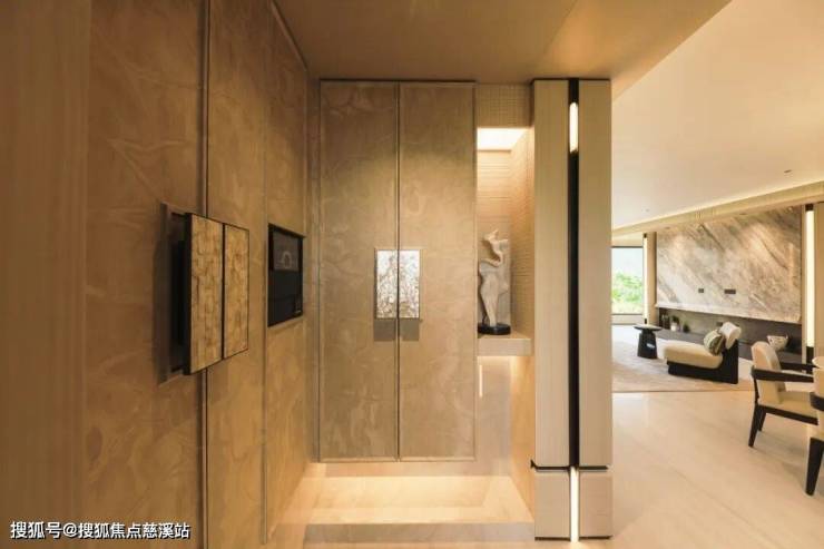 私享的独立电梯厅,是归家的第一道隐屏,隔绝同层干扰的同时,更可拓展为延伸玄关。放置通勤包、收纳雨具,从踏入电梯厅的一刻,外界纷扰便悄然卸下;步入室内,独立玄关承接仪式感,可定制通顶收纳柜,分层规划成人鞋区、儿童鞋区与常用物品区。入门即拂却尘嚣,让每一次归家,都成为对生活的尊崇礼遇。