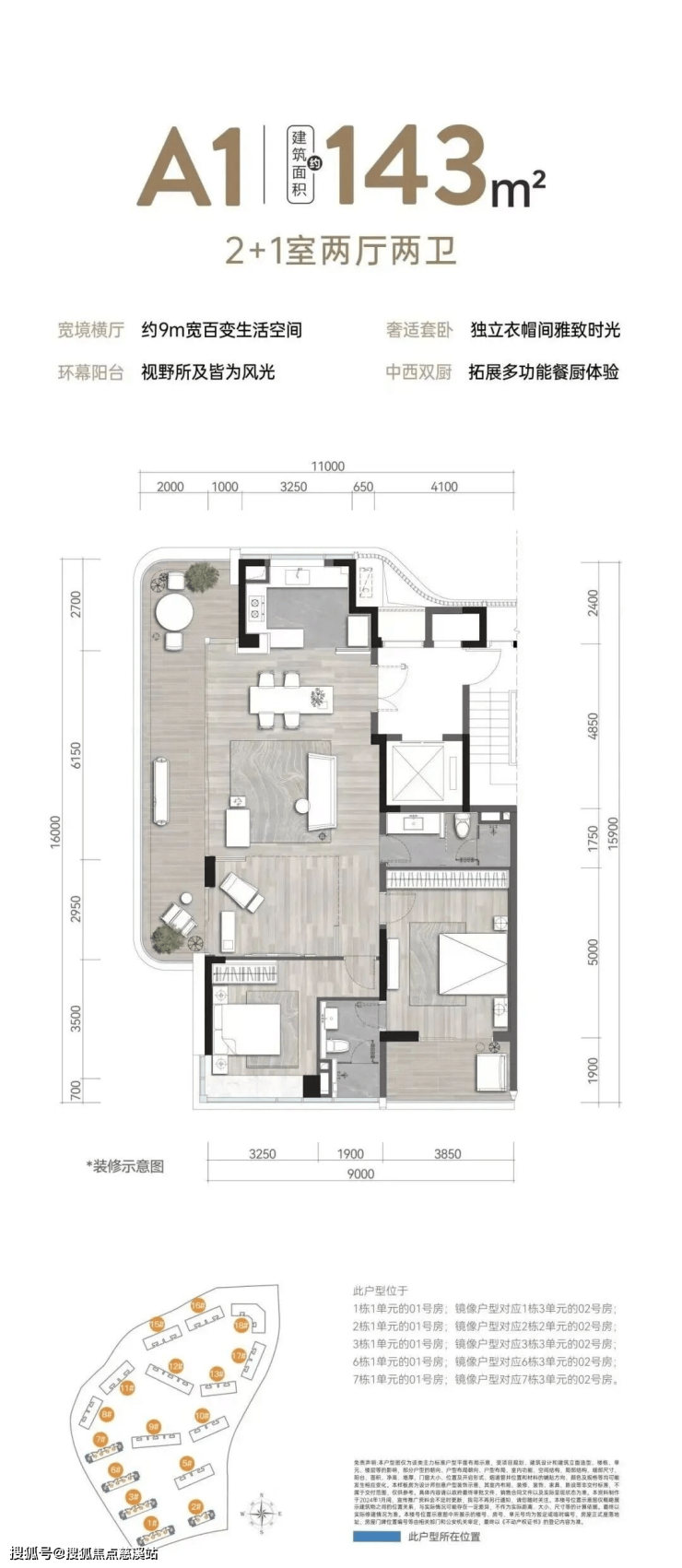 :约 9m 宽境横厅,解锁百变生活场景;环幕阳台设计,视野所及皆风光;奢适套卧带独立衣帽间,私享雅致时光;中西双厨配置,拓展餐厨功能体验。