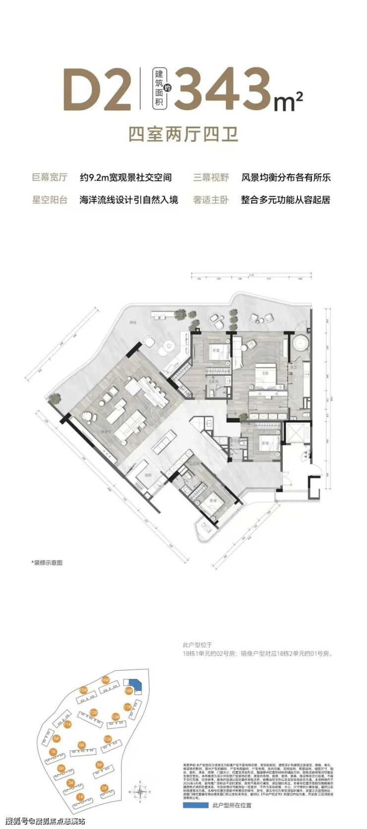 :双入户空间,私密感与尊崇感升级;花园式套房带花园阳台,揽景自然;约 9.2m 巨幕宽厅,欢聚会客尽显气派;270° 全景舱式阳台,俯瞰环幕胜景。