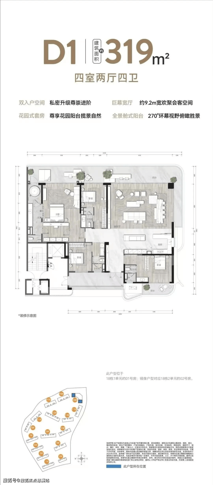 :花园入户设计,莳花弄草享闲情;约 9.4m 宽景横厅,聚会待客更从容;巨幕阳台拓展观景视野与生活边界;奢适套卧高定配置,彰显尊崇生活。