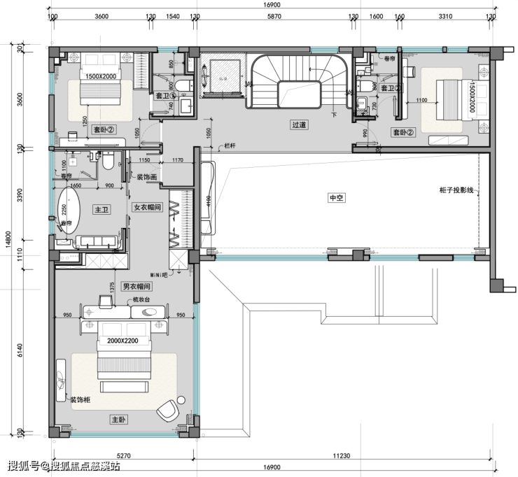 二层卧室布局错落有致,挑空区丰富空间层次;