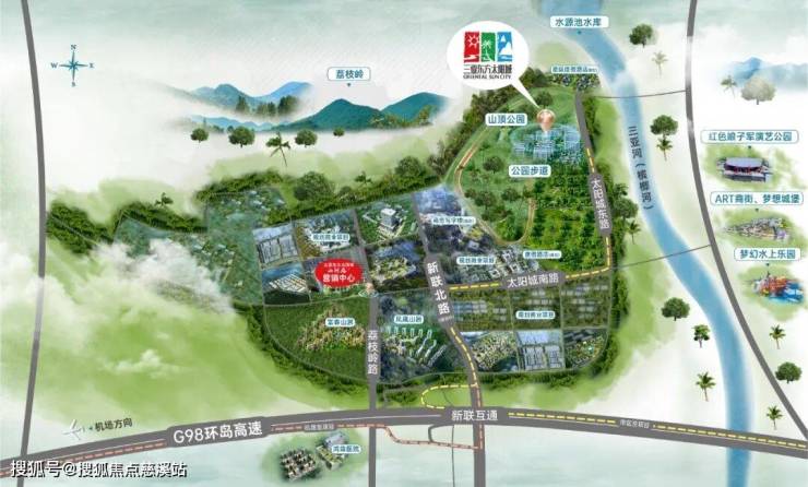 三亚·东方太阳城,西卧山顶公园,东拥三亚河(槟榔河),近享水源池水库、荔枝岭生态景观,面朝三亚主城区、三亚湾等,以山河为靠,以繁华为景,打造天赋上境栖居地。