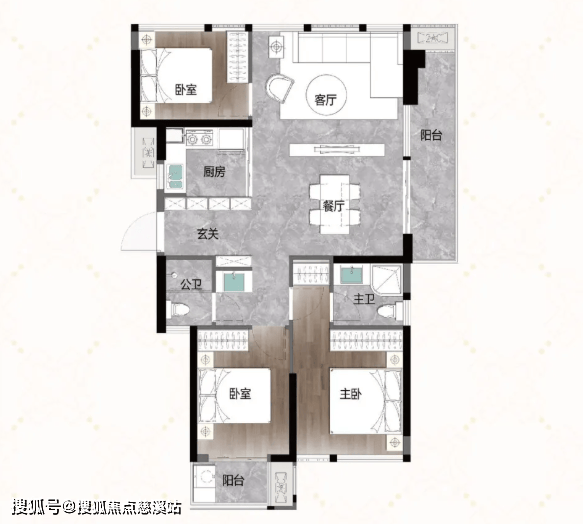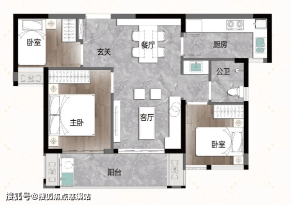 102平米:三房两厅两卫,进深大面宽小,客餐厅一体,两个阳台。