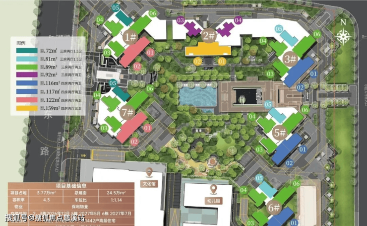 项目采用围合式设计,6栋47层高塔楼设计,小区自身配建有文化体育场馆和幼儿园,除了2#楼王是两梯四户,其余均为三梯六户,8#是5层高的文化馆,9#是配建3层高的幼儿园。