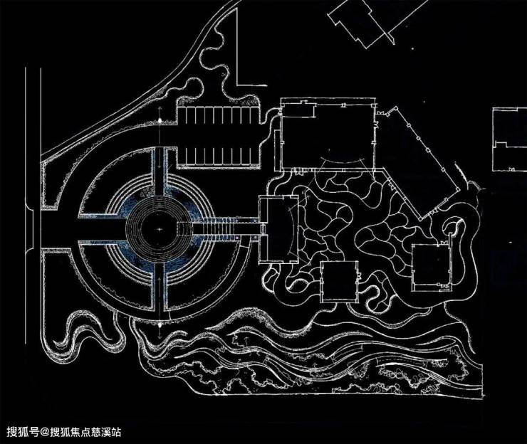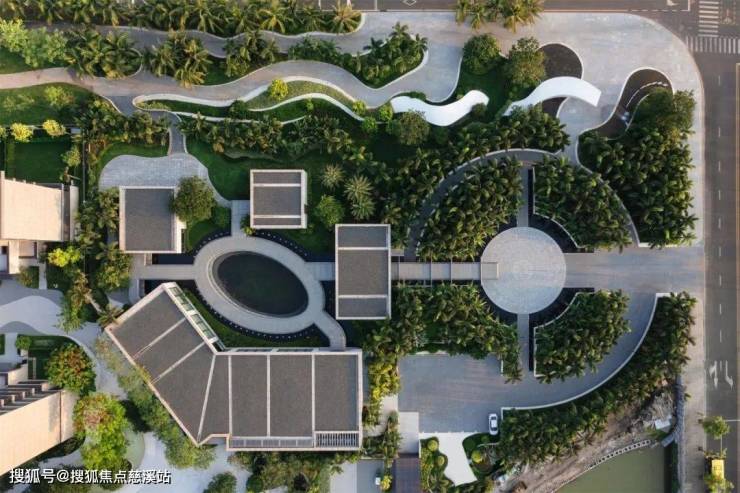场地入口西南侧为城市快速通道,由于城市开发进度较缓,目前周边的城市风貌还未完善。我们不希望到达体验受外部空间的影响,所以将入口到达空间向场地内推进,围合出一个正圆形空间,同时沿着四周升起绿坡。这样就可以创造出一段体验感极好的车行落客通道。最终的落客区位于一个圆形花岗岩平台上,平台整体漂浮在浅蓝色的水面上,四周被浓密的棕榈林台地包裹着,有种不被外界打扰的尊贵幽静感。为了更好的划分人、车行流线,我们设置了一个十字轴线的路网结构,与外部环形流线连通,内圆心动线以车行落客为主,北侧外圆动线是为豪车专设的停车动线,南侧外圆动线则是利用两侧绿坡形成 一条夹道,散步入园的人们可以在步移景异中到达会所。