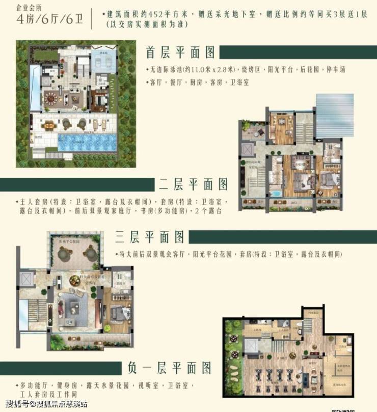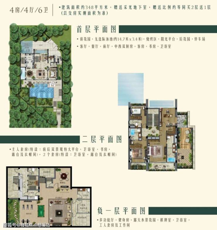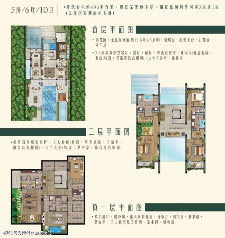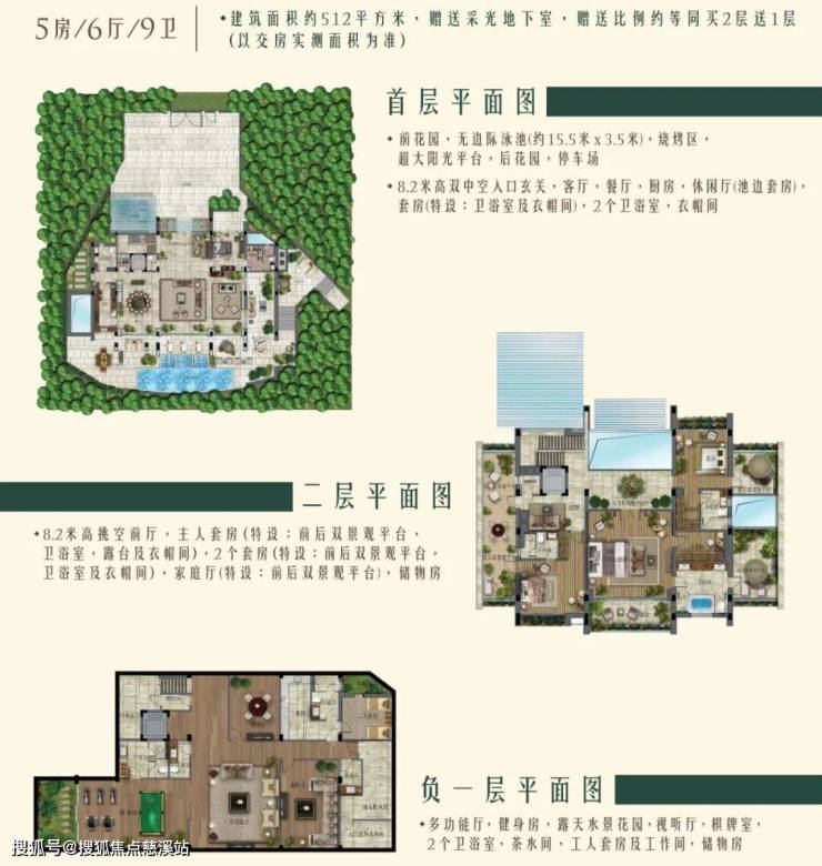 建筑面积:518㎡,实际使用面积约560平,占地约500平,5房6卫,层高4米。唯一地上三层地下一层的户型,顶层露台可观海,带电梯竖井,配备50平泳池,步行两分钟到达沙滩