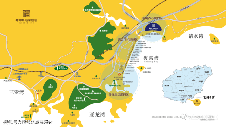 区位:国家海岸海棠湾,作为国家重点打造的综合性度假湾区, 22公里海岸线上,拥有比肩世界著名滨海旅游度假区的优越资源。为承载国家热带滨海旅游度假形象,以滨海酒店带、游艇休闲港、医疗及健康疗养基地三大核心,全面升级旅游度假产业。拥有12万平米免税购物中心、国家级医疗健康疗养基地解放军301总院海南分院、32家国际滨海酒店、拥有世界一流游艇基地、国际锦标赛级高尔夫球场、国家海洋公园、南中国影视城、梦幻娱乐不夜城、五星级IMAX万达娱乐影城、“神州第一泉”南田温泉等顶级度假配套。