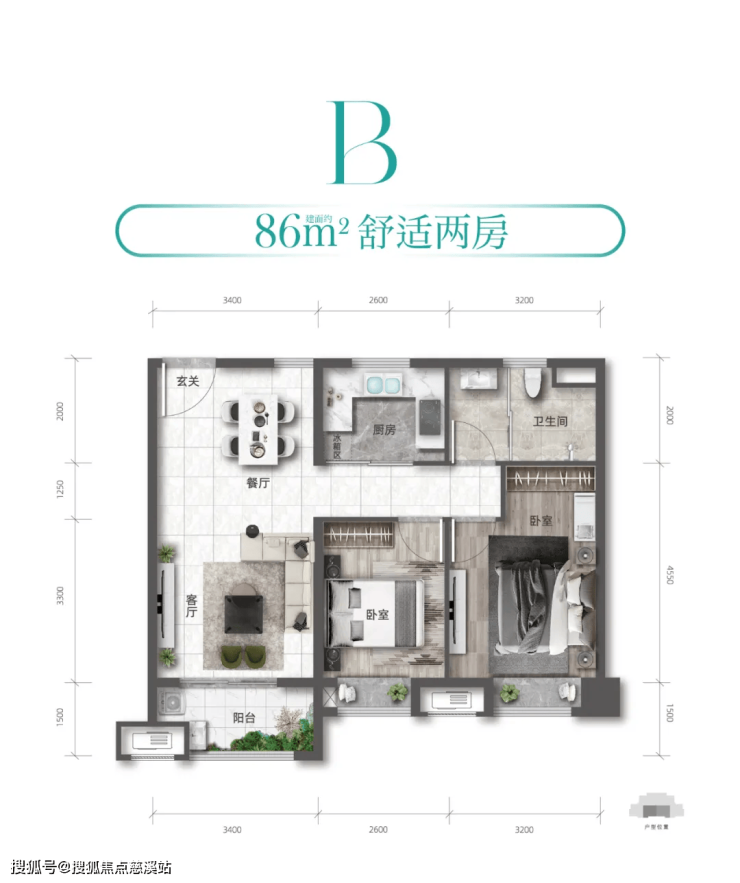 B户型:约86㎡ | 2房1卫 |
