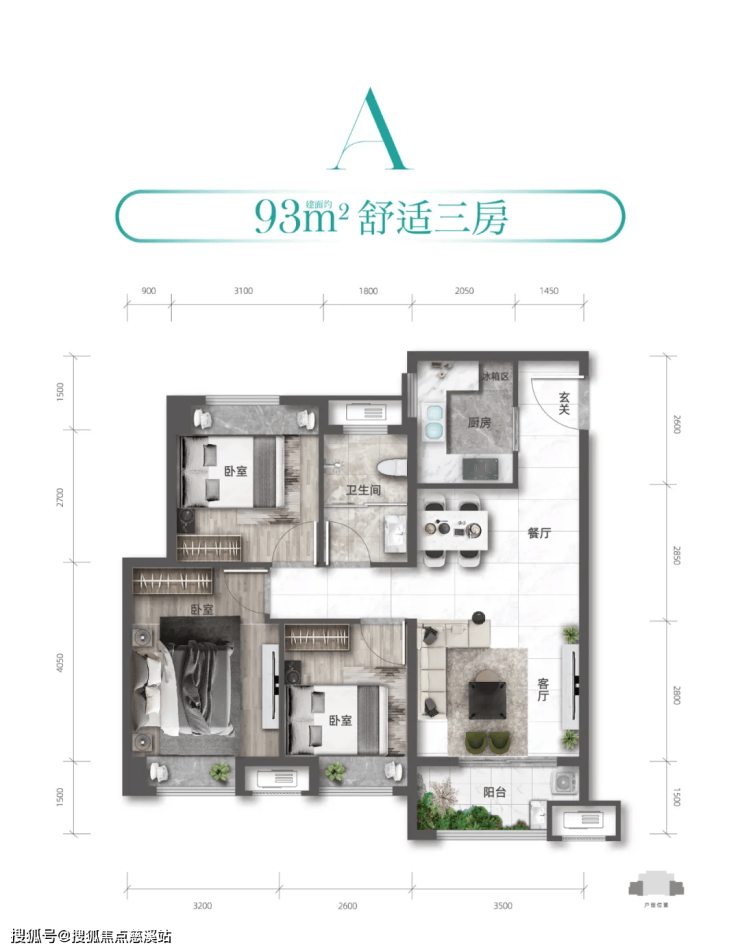 A户型:约93㎡ | 3房1卫 |